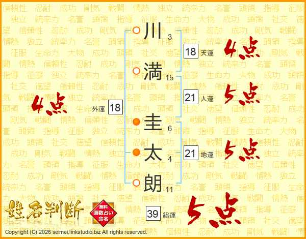 川(3画)満(15画) 圭(6画)太(4画)朗(11画)