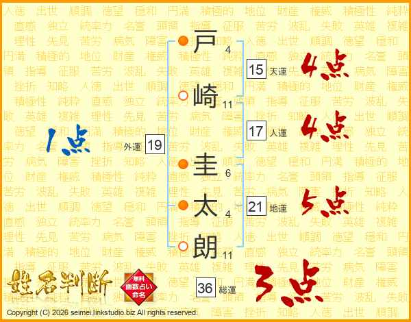 戸(4画)崎(11画) 圭(6画)太(4画)朗(11画)