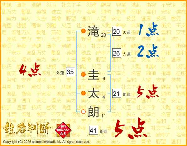 滝(20画) 圭(6画)太(4画)朗(11画)