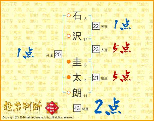 石(5画)沢(17画) 圭(6画)太(4画)朗(11画)