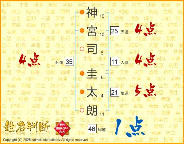 神(10画)宮(10画)司(5画) 圭(6画)太(4画)朗(11画)