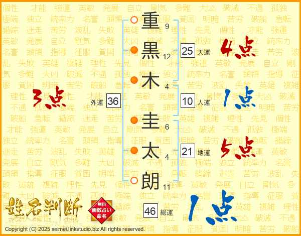 重(9画)黒(12画)木(4画) 圭(6画)太(4画)朗(11画)