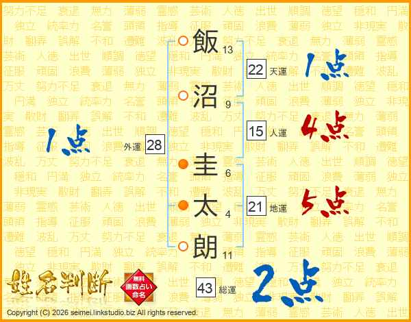 飯(13画)沼(9画) 圭(6画)太(4画)朗(11画)