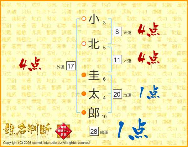小(3画)北(5画) 圭(6画)太(4画)郎(10画)