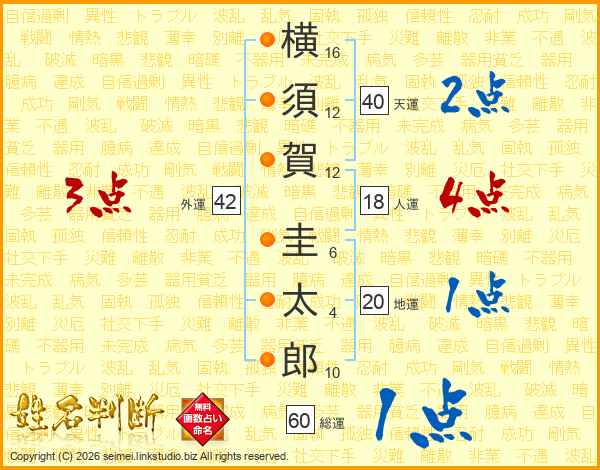 横(16画)須(12画)賀(12画) 圭(6画)太(4画)郎(10画)