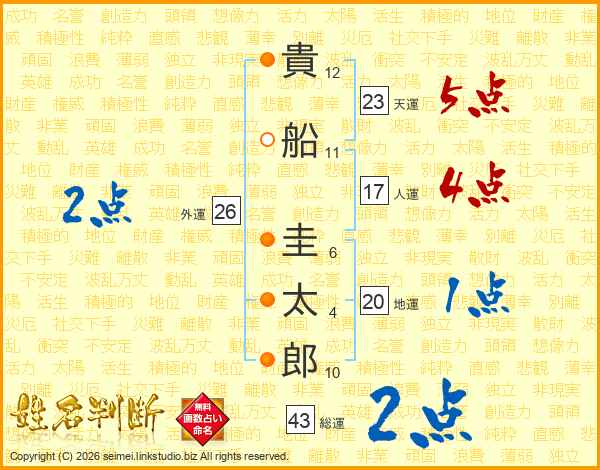 貴(12画)船(11画) 圭(6画)太(4画)郎(10画)