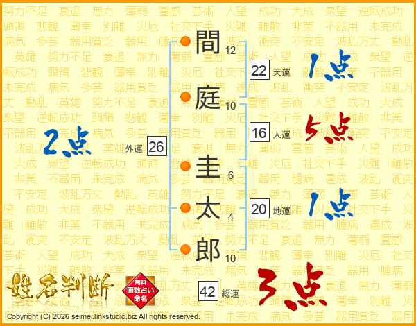 間(12画)庭(10画) 圭(6画)太(4画)郎(10画)
