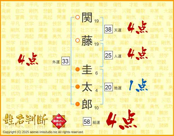 関(19画)藤(19画) 圭(6画)太(4画)郎(10画)