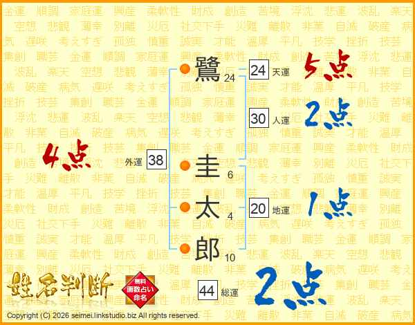 鷺(24画) 圭(6画)太(4画)郎(10画)
