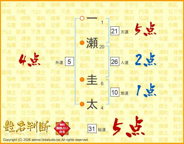 一(1画)瀬(20画) 圭(6画)太(4画)