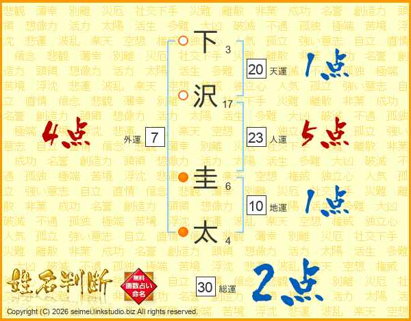 生活面を象徴する運勢です。外部から受ける影響力を表し、結婚運、家庭運や職場、環境への順応性を表します。総運から人運を引いた画数。姓や名が1文字の場合を除く。