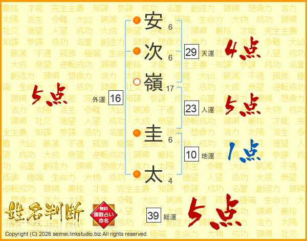 安(6画)次(6画)嶺(17画) 圭(6画)太(4画)