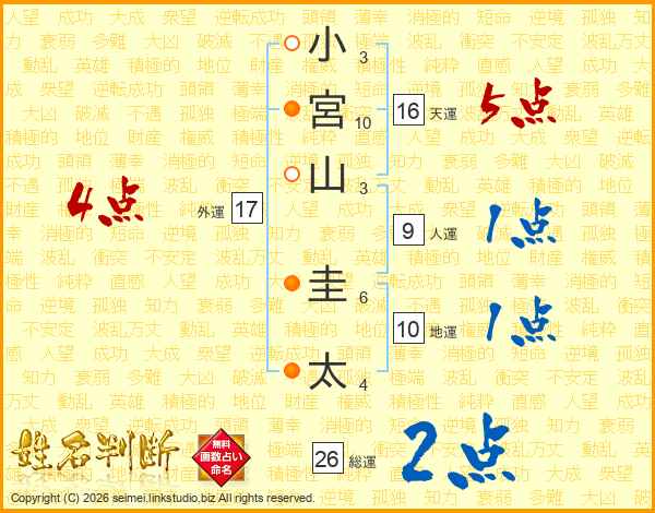 小(3画)宮(10画)山(3画) 圭(6画)太(4画)