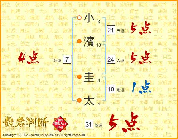 あなたの人生を表す1番重要な運勢です。生涯を通じて影響する総合運となり、主に50歳以降の晩年期に影響を及ぼします。苗字と名前の合計画数。