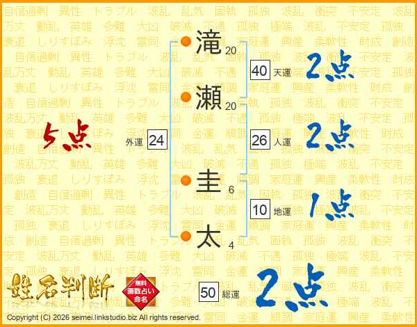 滝(20画)瀬(20画) 圭(6画)太(4画)