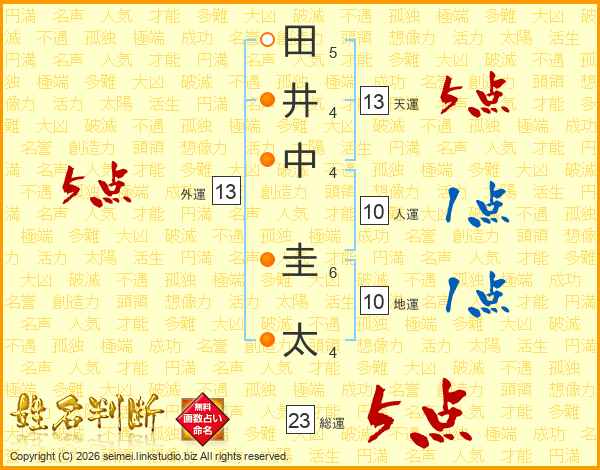 田(5画)井(4画)中(4画) 圭(6画)太(4画)