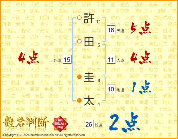 あなたの人生を表す1番重要な運勢です。生涯を通じて影響する総合運となり、主に50歳以降の晩年期に影響を及ぼします。苗字と名前の合計画数。