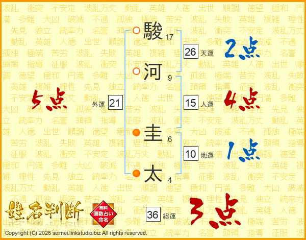 生活面を象徴する運勢です。外部から受ける影響力を表し、結婚運、家庭運や職場、環境への順応性を表します。総運から人運を引いた画数。姓や名が1文字の場合を除く。