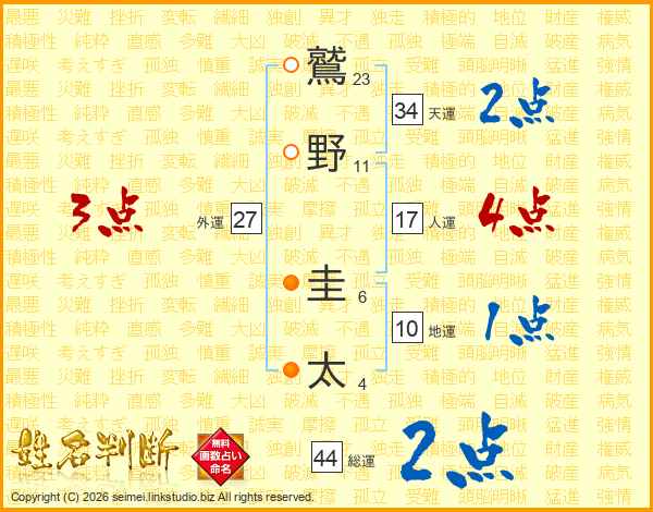 鷲(23画)野(11画) 圭(6画)太(4画)