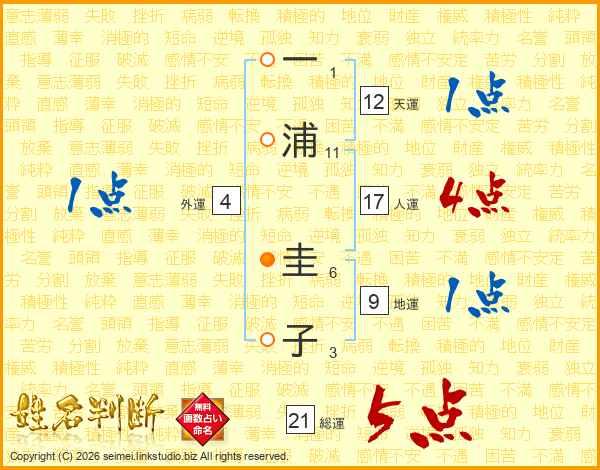 生活面を象徴する運勢です。外部から受ける影響力を表し、結婚運、家庭運や職場、環境への順応性を表します。総運から人運を引いた画数。姓や名が1文字の場合を除く。