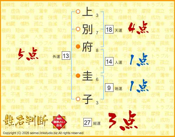 上(3画)別(7画)府(8画) 圭(6画)子(3画)