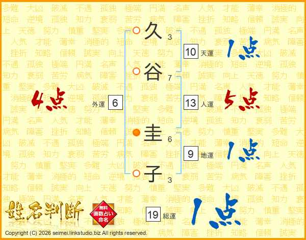 久(3画)谷(7画) 圭(6画)子(3画)