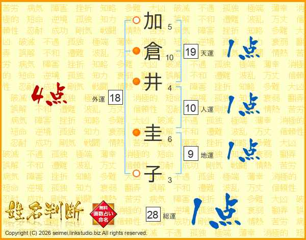 加(5画)倉(10画)井(4画) 圭(6画)子(3画)