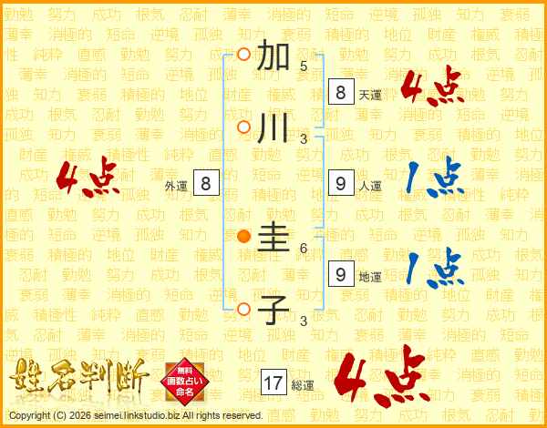 生活面を象徴する運勢です。外部から受ける影響力を表し、結婚運、家庭運や職場、環境への順応性を表します。総運から人運を引いた画数。姓や名が1文字の場合を除く。