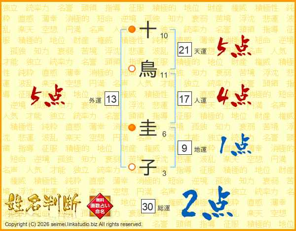 十(10画)鳥(11画) 圭(6画)子(3画)