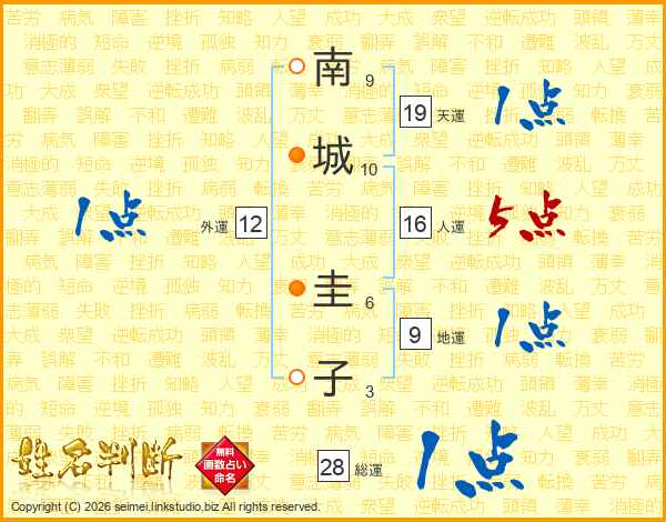 南(9画)城(10画) 圭(6画)子(3画)