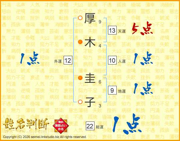 厚(9画)木(4画) 圭(6画)子(3画)