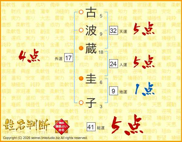 古(5画)波(9画)蔵(18画) 圭(6画)子(3画)