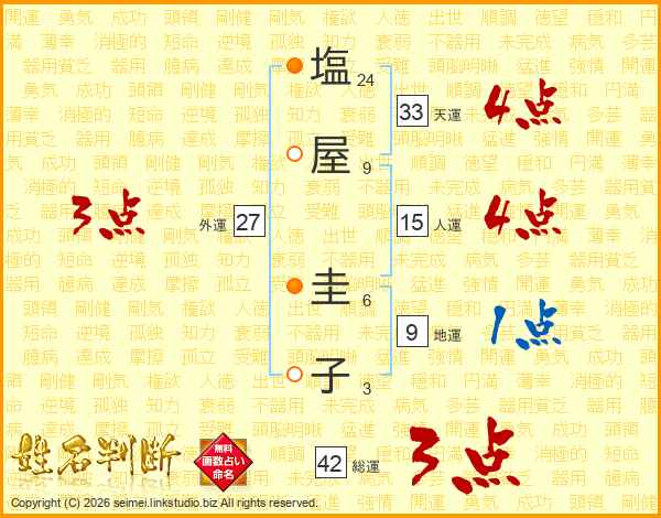 塩(24画)屋(9画) 圭(6画)子(3画)