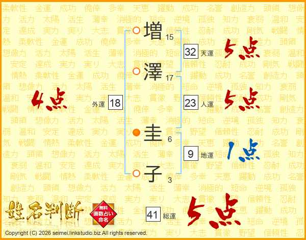 あなたの人生を表す1番重要な運勢です。生涯を通じて影響する総合運となり、主に50歳以降の晩年期に影響を及ぼします。苗字と名前の合計画数。