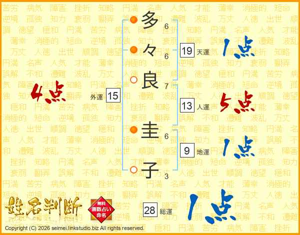 多(6画)々(6画)良(7画) 圭(6画)子(3画)