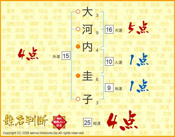 大(3画)河(9画)内(4画) 圭(6画)子(3画)