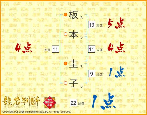 あなたの人生を表す1番重要な運勢です。生涯を通じて影響する総合運となり、主に50歳以降の晩年期に影響を及ぼします。苗字と名前の合計画数。