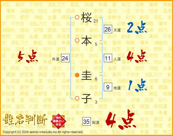 桜(21画)本(5画) 圭(6画)子(3画)