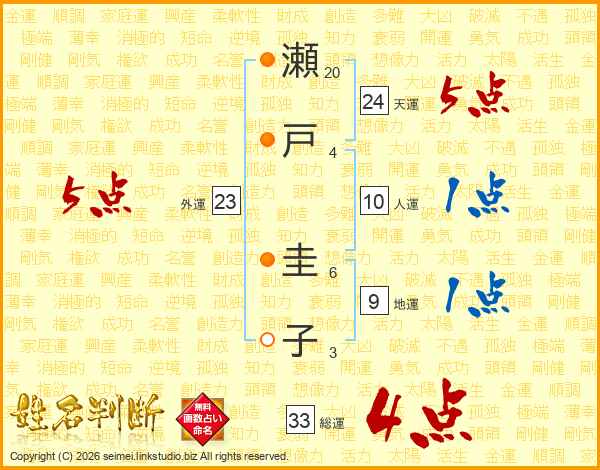 瀬(20画)戸(4画) 圭(6画)子(3画)