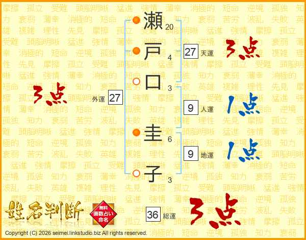 瀬(20画)戸(4画)口(3画) 圭(6画)子(3画)