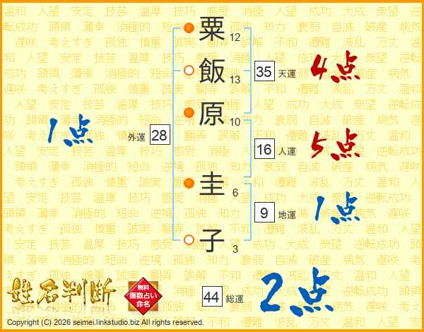 粟飯原圭子さんの総運は44画の2点!