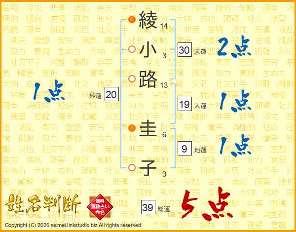 綾(14画)小(3画)路(13画) 圭(6画)子(3画)