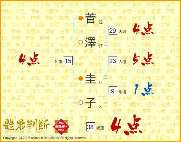 菅(12画)澤(17画) 圭(6画)子(3画)