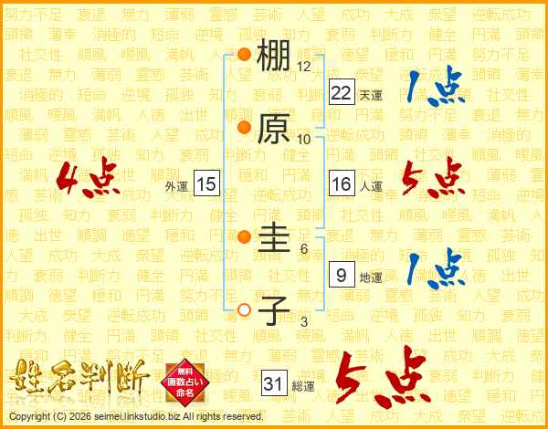 あなたの人生を表す1番重要な運勢です。生涯を通じて影響する総合運となり、主に50歳以降の晩年期に影響を及ぼします。苗字と名前の合計画数。