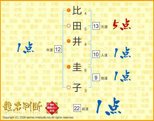 比(4画)田(5画)井(4画) 圭(6画)子(3画)