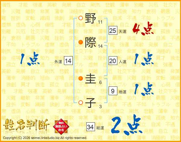 野(11画)際(14画) 圭(6画)子(3画)