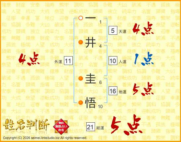 あなたの人生を表す1番重要な運勢です。生涯を通じて影響する総合運となり、主に50歳以降の晩年期に影響を及ぼします。苗字と名前の合計画数。