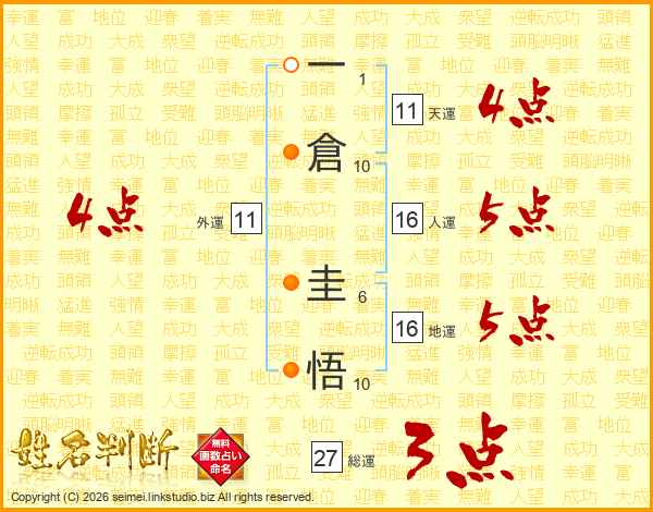 一(1画)倉(10画) 圭(6画)悟(10画)