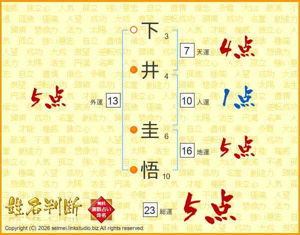 あなたの人生を表す1番重要な運勢です。生涯を通じて影響する総合運となり、主に50歳以降の晩年期に影響を及ぼします。苗字と名前の合計画数。