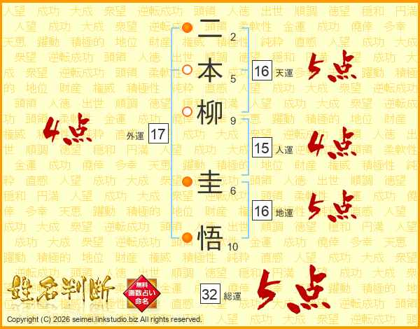 二(2画)本(5画)柳(9画) 圭(6画)悟(10画)